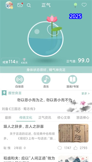 正氣APP內置戒色書庫,收錄100+本修心經典和人生智慧著作。靜心音樂板塊提供專門錄制的禪樂專輯,而名言警句功能每日推送勵志箴言。修心文章板塊由專家團隊撰寫,涵蓋孝道培養、善行實踐等內容,日均閱讀量超過5萬次。