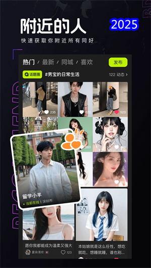 1. 興趣社交匹配:彩蝶的"彩虹匹配引擎"基于性別認同、興趣愛好等300+維度進行智能推薦;"滑卡速配系統"實現1秒極速連接,配合"社群文化過濾器"確保匹配質量;"變裝美學評分"功能幫助用戶獲得穿搭建議,用戶匹配滿意度達88%。