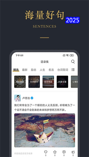 結構化分類系統整理文學好句、勵志語錄等20+類別,權威出處標注確保內容真實性。高清配圖庫每句匹配意境圖片,全文檢索功能支持關鍵詞快速定位,資源豐富度獲用戶92%好評。