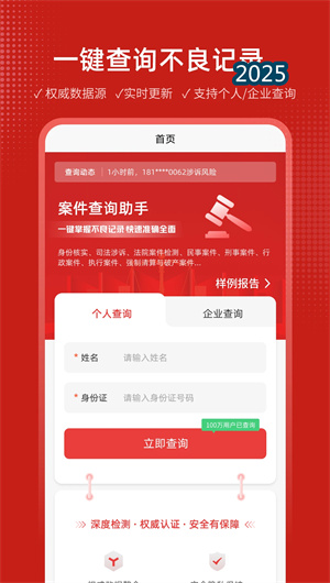1. 雙軌查詢模式并重,滿足多元應用場景:軟件創新性地將個人案件查詢與企業案件查詢兩大核心功能無縫整合于同一平臺,滿足了用戶多樣化的查詢需求。無論是個人在借貸、婚戀等場景下的背景了解,還是企業在投資、采購、雇傭等環節的風險控制,本案件查詢助手都能提供針對性的查詢服務。這種一體化的設計避免了用戶在不同平臺間切換的麻煩,極大地提升了查詢效率和應用便利性。