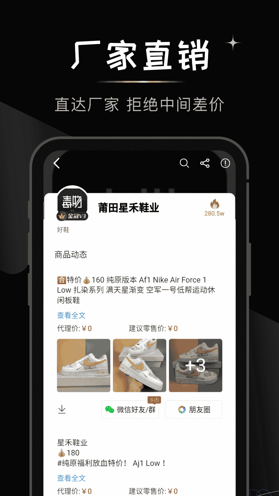 4、強大的商品動態圈,各廠家發布貨源信息到動態里,用戶可以聯系商家,也可以將貨源信息轉發到微信好友群和朋友圈。