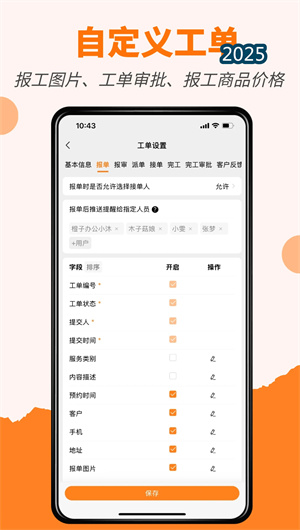 1. 橙子工單APP的核心功能體現在其靈活的工單自定義配置系統,企業可根據業務需求設置工單基礎信息、搶單規則、報工審批流程和收費節點等參數。通過可視化流程設計器和規則引擎,管理員能夠快速配置符合企業特色的工單模板,配合權限管理體系和角色配置功能,實現精細化的流程控制。該功能通過建立標準化作業流程和異常處理機制,使企業工單處理效率提升約58%,顯著降低了運營管理成本。