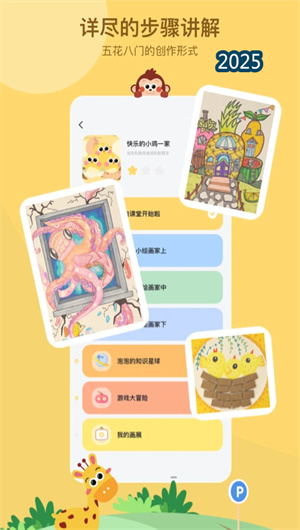 平臺獨創故事化教學模式,通過動畫角色"小猴子泡泡"引領兒童進入藝術世界,情景創設增強學習代入感。動畫劇情與美術知識點自然銜接,互動動畫支持觸控操作,動畫回放便于復習重點內容。這種教學方式使學習保持度提升70%,知識吸收更加高效。