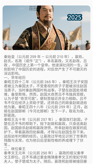 1. 多維人物解析與智慧挖掘功能:通過專業的歷史人物深度解析系統,平臺對每位歷史人物構建了完整的人物畫像模型,包含其生平事跡、性格特質、重要決策等維度。系統采用智慧萃取技術從人物經歷中提煉出具有普世價值的智慧啟示,并生成詳細的人物影響力評估報告。用戶可通過時間軸導航功能追溯人物一生的重要節點,配合關聯事件圖譜理解其每個決策背后的深層邏輯,從而獲得系統性的歷史認知。