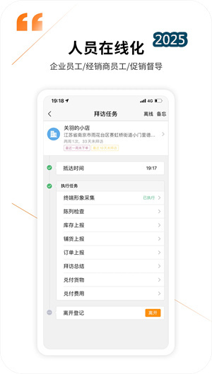 3. 勤策APP建立智能的終端門店管理體系,通過門店檔案和分級管理實現(xiàn)對終端網(wǎng)絡的精準覆蓋。系統(tǒng)提供門店巡檢和陳列檢查功能,支持銷售數(shù)據(jù)采集和動銷分析。該特色還包含門店服務和問題處理,幫助銷售團隊提升終端服務質量,增強門店合作黏性。