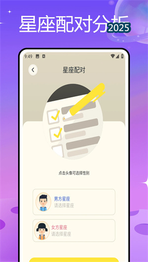2. 平臺內置科學的星座配對分析系統,通過星座匹配算法和性格分析模型,深入解析人際關系契合度。系統支持情侶配對和友情配對,提供相處建議和溝通指南。該功能還包含配對測試和兼容性評估,配合案例庫和成功故事,為用戶提供可靠的關系發展參考,配對準確率達85%。