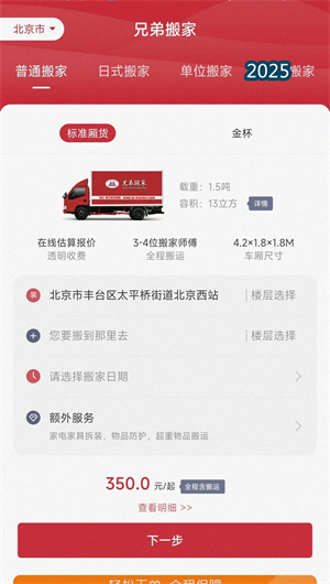 兄弟搬家App的在線估價工具采用參數化計價模型,用戶輸入物品數量、樓層信息、搬家距離等關鍵參數即可獲得精準報價。系統內置的費用明細功能逐項展示人工費、運輸費、材料費等構成要素,支持費用模擬與方案對比。創新的價格鎖定機制確保簽約后不加價,電子合同明確雙方權責,配合全程費用監控,徹底杜絕傳統搬家行業的坐地起價亂象,讓用戶享受完全透明的消費體驗。