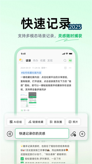話袋App的核心功能始于其極致流暢的碎片化記錄體驗。應用啟動速度經過深度優化,實現1秒打開,且界面無廣告干擾,真正做到打開即記,讓用戶靈感涌現的瞬間能被毫無負擔地捕獲。這種無壓記錄體驗延伸至全面的內容類型,無論是文本筆記、圖片素材、音頻靈感,還是來自各平臺的網頁鏈接,都能通過話袋的一鍵收藏功能,集中收藏到統一的個人知識庫中,實現了真正意義上的一站式記錄,確保了信息入口的全面與高效。