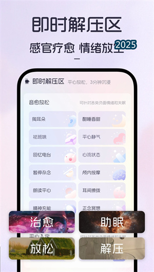 愈個朋友App構(gòu)建了精準的情緒識別機制,通過智能算法對用戶的情緒狀態(tài)進行實時分析。當(dāng)用戶進入即時解壓區(qū)后,系統(tǒng)會根據(jù)當(dāng)前的情緒特征,從焦慮緩解、孤獨陪伴、煩躁平復(fù)等八個維度提供個性化的解壓方案。這些方案結(jié)合了白噪音療愈、呼吸引導(dǎo)與正念冥想等專業(yè)方法,形成完整的情緒調(diào)節(jié)閉環(huán)。數(shù)據(jù)顯示,該功能能幫助85%的用戶在5分鐘內(nèi)實現(xiàn)情緒狀態(tài)的顯著改善,有效恢復(fù)心理平衡。