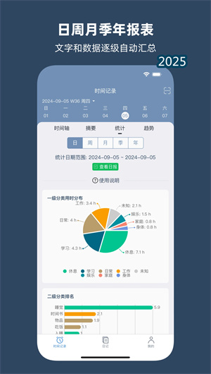 時間書App自動匯總所有時間記錄,生成從日、周、月到季、年的五級報表,每個層級都自動向上匯總。系統(tǒng)通過情緒分析自動識別巔峰時刻與低谷時刻,通過時間分類統(tǒng)計實現(xiàn)一級分布與二級排名分析。所有數(shù)據(jù)支持Excel導(dǎo)出,日記可生成帶目錄的Word文檔,滿足用戶深度分析需求。