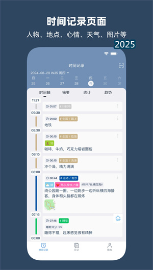 時間書App的日記生成系統(tǒng)能夠自動將時間記錄轉(zhuǎn)化為結(jié)構(gòu)化的日記摘要,支持添加圖片記錄、人物標簽等豐富元素。特別的過去今日功能讓用戶可以一鍵回溯歷史上的今天,查看往期記錄。這種智能日記不僅節(jié)省了用戶手動整理的時間,更提供了獨特的人生回顧體驗。