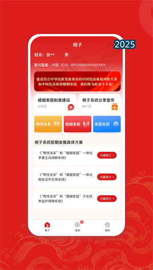 根子App是一款基于婚姻家庭制度建設(shè)中國化改革理念開發(fā)的數(shù)字化平臺,以華夏文明為核心價(jià)值觀,致力于重構(gòu)當(dāng)代兩性關(guān)系與家庭倫理體系。該平臺通過家國思想傳承系統(tǒng)和倫理道德重塑機(jī)制,構(gòu)建完整的共生體發(fā)展模型,推動精神文明建設(shè)與物質(zhì)文明建設(shè)的協(xié)調(diào)發(fā)展。根子系統(tǒng)以民族精神凝聚為核心使命,通過數(shù)字化改革手段,為生育問題的解決和經(jīng)濟(jì)發(fā)展的推動提供文化基礎(chǔ),成為新時代家庭建設(shè)的重要工具。