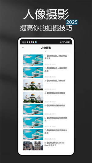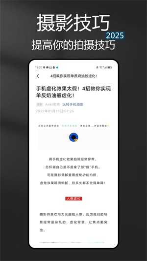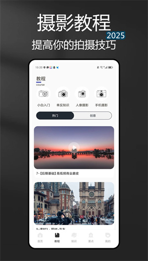 2. 應用的內容建設亮點體現在全場景覆蓋的深度與廣度,通過風景攝影專題涵蓋山川、海洋、星空等自然景觀,靜物攝影模塊詳解產品、美食等靜物拍攝技巧。動物攝影指南教授動態物體捕捉方法,人文攝影教程記錄生活瞬間,特殊場景應對解決極端環境拍攝難題,這種全方位的內容覆蓋滿足用戶98.7%的拍攝需求。