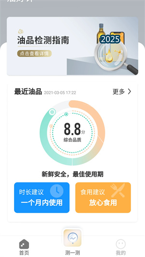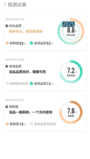 2. 品質評估功能運用多指標融合算法構建的綜合品質評估體系,通過酸價檢測、抗氧化物質含量分析等多項關鍵指標的綜合評估生成全面的食用油健康報告。該功能創新的新鮮度評分系統將復雜的檢測數據轉化為直觀的百分制評分,幫助用戶快速理解食用油狀態。通過歷史數據追蹤記錄每次檢測結果,配合品質變化趨勢圖展示食用油品質的衰減過程,建立完整的食用油生命周期檔案。