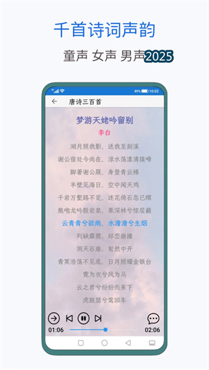 專業語音誦讀庫配備1000余首詩詞的標準化發音錄制,每首作品均提供童聲、青年女聲、青年男聲三種音色的國風誦讀版本。多音字校對系統通過人工審核確保發音準確,后臺播放器支持連續播放、循環播放、定時關閉等多樣化模式。聲韻訓練模塊結合《聲律啟蒙》等傳統韻書,幫助用戶掌握詩詞格律,這些功能使用戶的詩詞韻律掌握度提升55%。