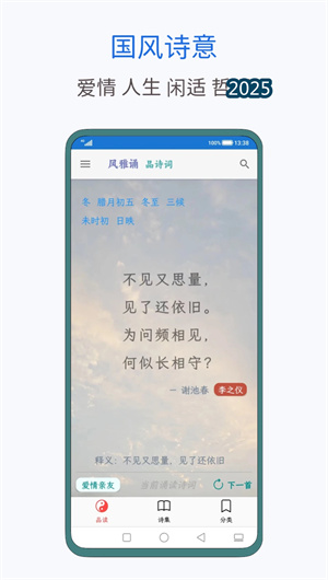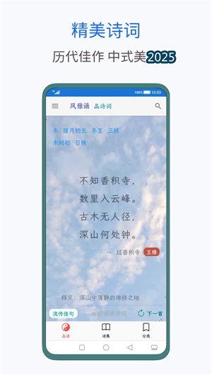 風雅誦詩詞App是一款集詩詞鑒賞、聲韻研習與文化傳承于一體的專業級古典詩詞學習平臺,以 詩意生活 為核心理念,通過智能推薦算法與多媒體交互技術,為用戶構建沉浸式的傳統文化體驗空間。該應用深度整合《詩經》《唐詩三百首》《唐宋名家詞選》等經典詩集,配備專業的語音誦讀系統與權威注本解析,打造了從詩詞鑒賞到聲韻感悟的完整學習閉環。平臺采用創新的十二時辰推薦機制與季節寒暑感知系統,目前收錄詩詞作品超過10000首,日均詩詞推送量達50萬次,用戶平均使用時長突破25分鐘,成為古典詩詞領域頗具影響力的數字化傳承平臺。