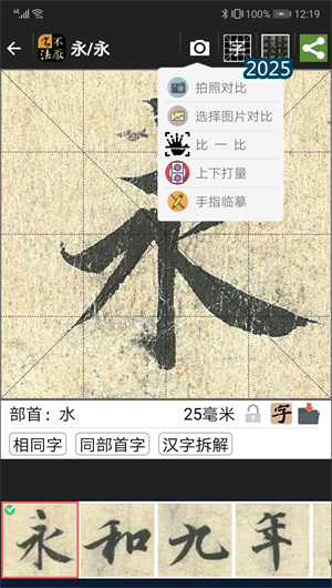 針對核心的臨摹練習環節,不厭書法提供了極其豐富的單字大圖頁工具集。在 “拍照選圖對比” 功能下,用戶可拍攝自己的練習作品,與碑帖原字進行透明化疊合比對,直觀發現差異。獨特的 “相機下比對” 功能利用手機攝像頭實現實時動態疊影對比,如同使用拷貝臺。此外,鏡面字圖功能可將字水平翻轉,幫助觀察結構;鎖定屏幕蒙紙拷貝則鎖定屏幕亮度,模擬傳統蒙紙描紅體驗。工具還提供漢字解釋,溯源字義演變,輔助理解書寫背景。這些工具共同構成了一個強大的數字化臨摹工作臺。