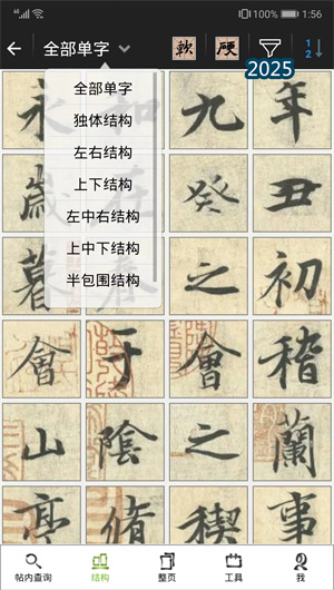 不厭書法APP的核心是龐大且組織有序的 “數字碑帖庫” 。用戶可通過多種方式查詢、了解、選擇心儀的碑帖,進入深度學習模式。該模式提供三種研習視角:整頁通覽以把握章法氣韻;單字結構分類視圖按偏旁部首或結構類型歸類單字,便于針對性學習;精準查詢功能可快速定位特定漢字。每件碑帖均配有高清掃描圖像,支持無極放大縮小,并可查看標注有實際尺寸大小的單字大圖,確保對筆觸、墨色與石刻風化的細節觀察達到實物級別,為用戶營造沉浸式的碑帖深度學習環境。