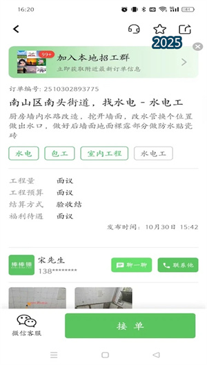 對于裝修師傅、工地小工等施工人員,棒棒錘APP是其獲取穩定收入的專屬平臺。平臺每日更新海量裝修訂單,覆蓋從大型家裝/工裝項目到零散維修的各類需求。師傅可根據自身工種專長和時間安排,在 “自由接單大廳” 中自主挑選訂單,實現 “多勞多得,收入無上限” 。接單后,師傅可通過APP內置工具與需求方溝通細節、確認方案。在施工過程中,雙方可更新訂單狀態、上傳階段性成果照片。訂單完成后,需經需求方在APP內確認驗收,方可進入結算流程。整個 “從接單到完工” 的過程清晰透明,所有記錄均留存在平臺,便于追溯與管理。