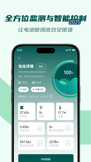 君能App的核心是其實時運行的多維度電池狀態監控引擎。通過連接車輛的OBD接口或專用的藍牙電池監測模塊,App可持續采集包括電壓穩定性、內阻變化、溫度曲線、剩余電量及充放電循環次數在內的關鍵電池健康參數。這些數據經云端電池算法模型實時分析后,在App端生成直觀的電池健康度評分與可視化性能報告。司機可隨時查看電池的實時負載狀態與歷史性能趨勢,系統會基于預設的安全閾值進行智能判斷,對電壓異常驟降、溫度過高等潛在風險通過多級預警推送機制(APP彈窗、短信、電話)及時告警,將安全隱患扼殺在萌芽狀態。