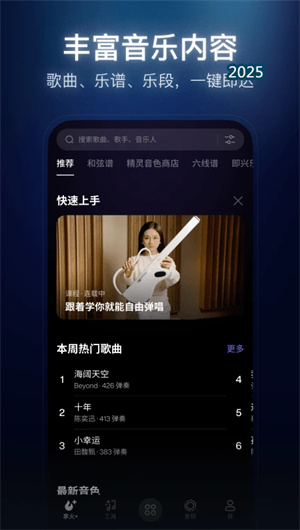 拿火+App的核心是內置的海量智能化歌曲譜庫。庫內精選并持續更新超過500首涵蓋不同風格與難度的熱門歌曲,每首歌曲均配有專為拿火智能吉他優化的 “易讀易彈奏”動態吉他譜。該譜庫采用智能難度分級系統,從“小白”到“大神”級別的用戶都能找到適合自己的曲目。當用戶選擇一首歌曲后,App會通過藍牙與拿火智能吉他連接,琴頸上的LED指示燈可同步指引指板位置,實現可視化跟彈學習。同時,每首歌均提供高質量的原版樂隊多軌伴奏,用戶可自由開關鼓點、貝斯等音軌,讓單一把吉他的彈奏也能立刻呈現出層次豐富、動聽的完整樂隊效果。