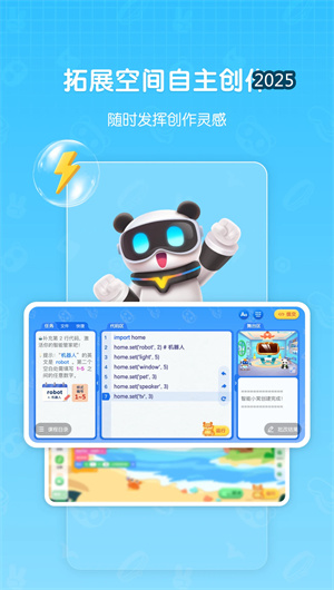 App不僅是一個學習平臺,更是一個集成化的創作工坊。除了基礎的編程環境,平臺集成了面向青少年的輕量化AI工具模塊,如AI繪畫助手、智能代碼補全提示、語音交互編程等,引導學員 “手把手學習前沿AI工具” ,用科技賦能創意表達。學員可以在此自由創作,將所學編程原理與AI能力結合,制作出更具想象力的作品,并一鍵分享至平臺社區或導出為獨立應用,在實踐中深化對未來時代通用語言的理解。
