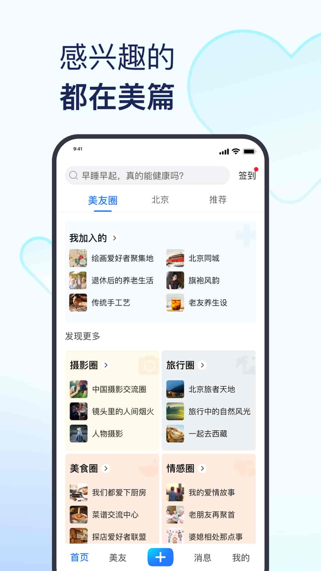 1、廣場:同城、退休俱樂部、攝影交流圈、文學愛好者聯盟、唱歌交流圈、媽媽育兒圈。