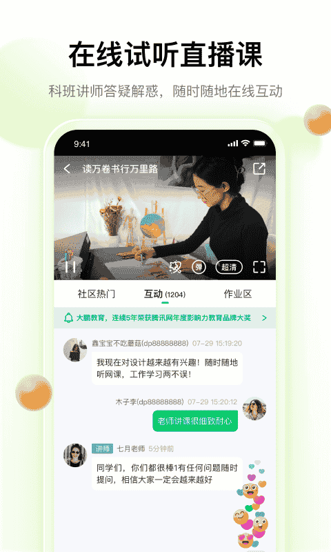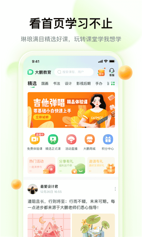 1、Get高效學(xué)習(xí)小助手,一鍵查課表或交作業(yè);大鵬視訊想了解的活動(dòng)展覽、學(xué)員故事、榮譽(yù)報(bào)道一目了然。