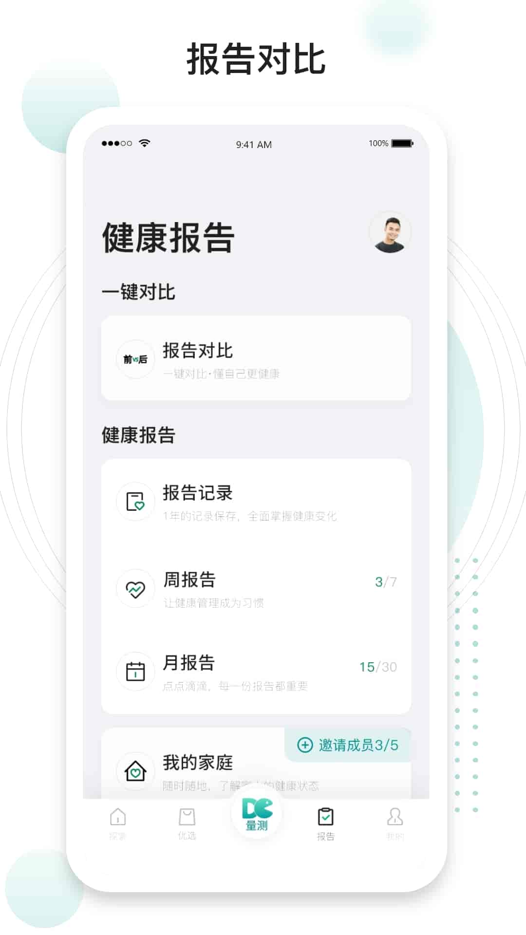 3、報告記錄,一年的記錄保存,全面掌握健康變化;周報告和月報告讓健康管理成為習慣;家庭報告隨時隨地了解家人的健康狀態。