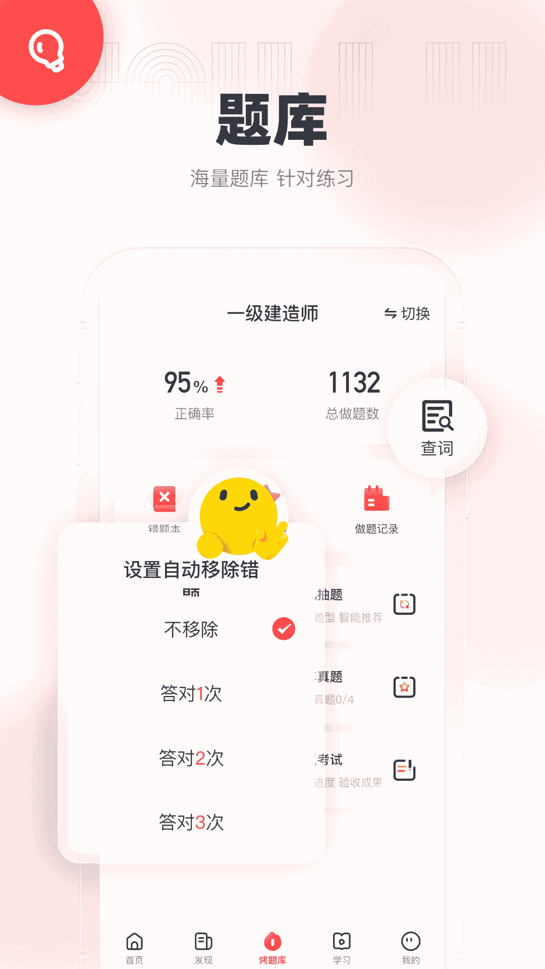 1、題庫(kù):每日一練、隨機(jī)抽題、模擬試卷、歷年真題、章節(jié)練習(xí)、模考大賽。