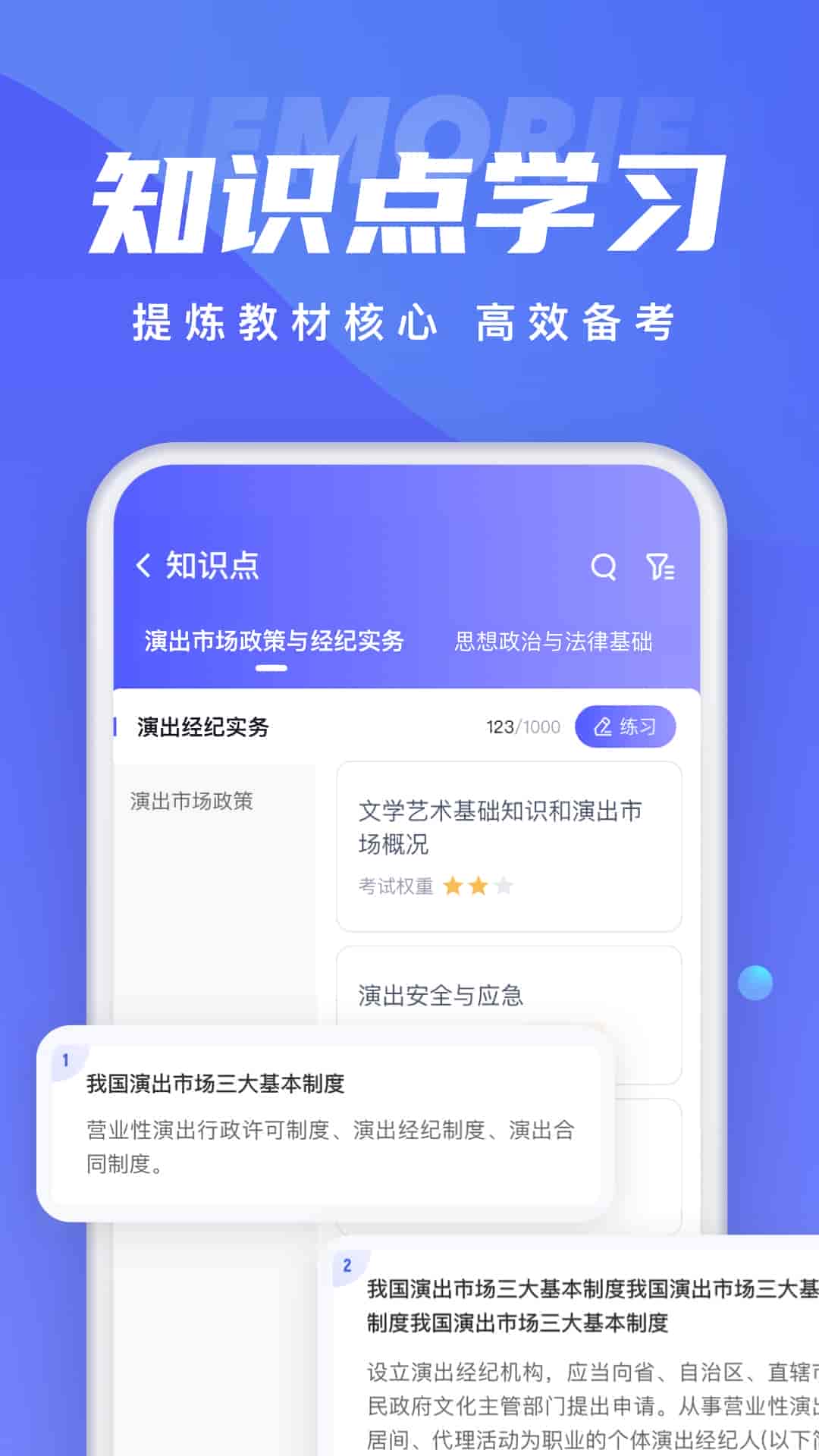 3、文學(xué)藝術(shù)基礎(chǔ)知識(shí)和演出市場概況一目了然,開始練習(xí)即可做題,記憶鞏固可查看知識(shí)點(diǎn)內(nèi)容復(fù)習(xí)。