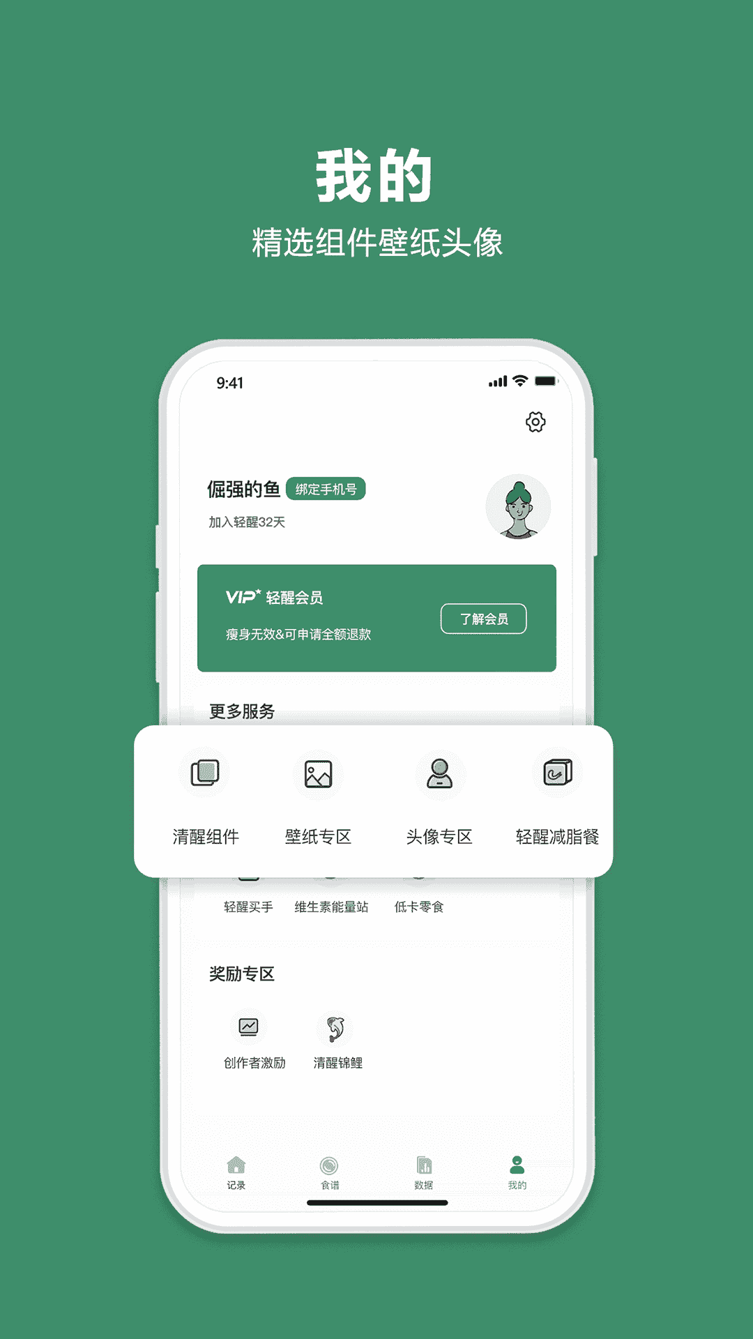 3、組件:記錄體重、喝水提醒、今日食譜、記錄飲食、減脂壁紙、熱量日歷。
