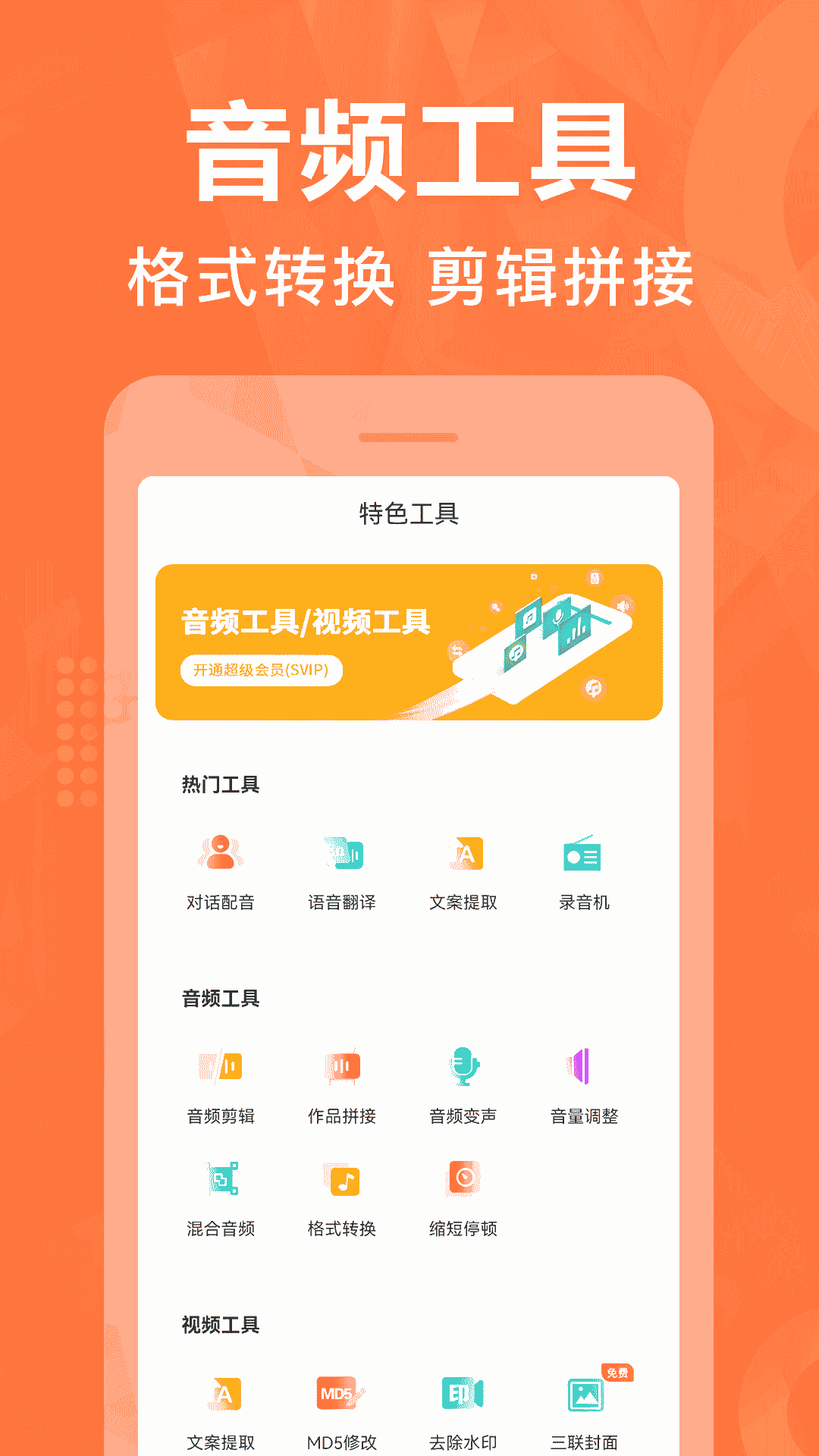 4、音頻工具:音頻剪輯、作品拼接、音頻變聲、音量調(diào)整、混合音頻、格式轉(zhuǎn)換、縮短停頓。