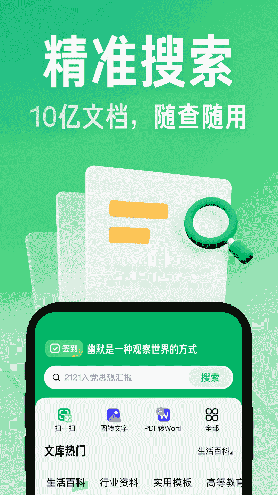 1、點擊搜索框,10億專業文檔資源免費搜,試題教案隨心下,如數學模擬題、英語模擬題、語文教案、教資公考真題。