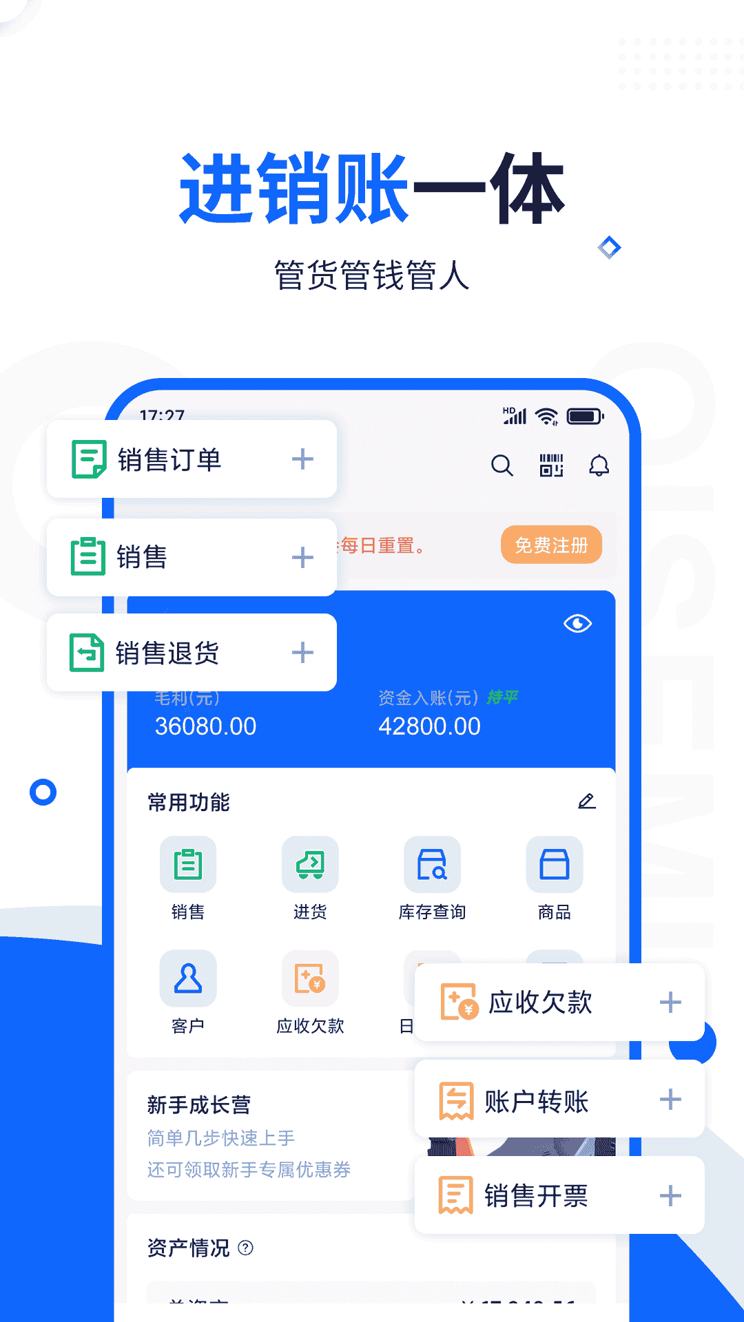 6、新手向導:錄商品、進貨、銷售、查庫存、查欠款、看報表、倉庫/員工、功能設置。