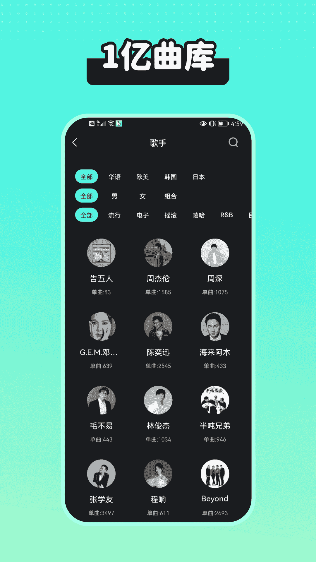 3、海量曲庫,熱門歌手,如周杰倫、鄧紫棋、薛之謙、林俊杰、張學友、周深、毛不易等歌手。