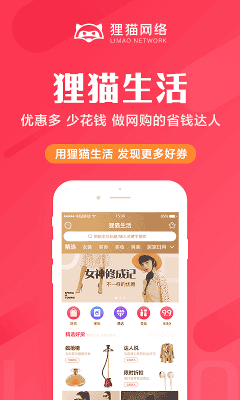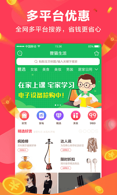 2、多平臺全場商品,不止五折,品牌特賣,限時秒殺,省錢直通車,貍貓網絡旗下購物省錢優惠工具。
