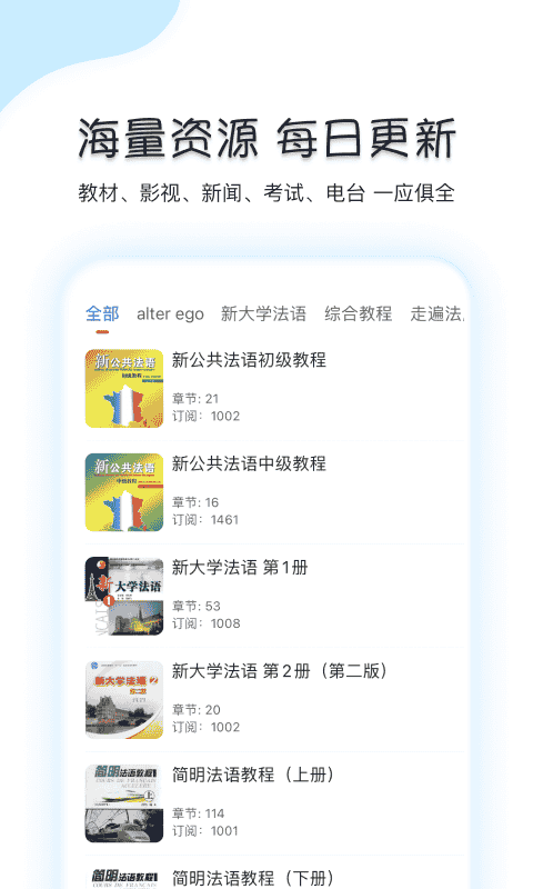 1、海量資源每日更新,教材、影視、新聞、考試、電臺一應俱全,法語資源傾心分享,共同學習成長。