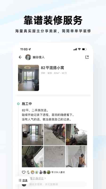 3、靠譜裝修服務(wù),海量真實(shí)屋主分享美家,如北歐風(fēng)溫馨小屋、日式風(fēng)小閣樓、復(fù)古與高級灰色的簡約大平層等裝扮日記。