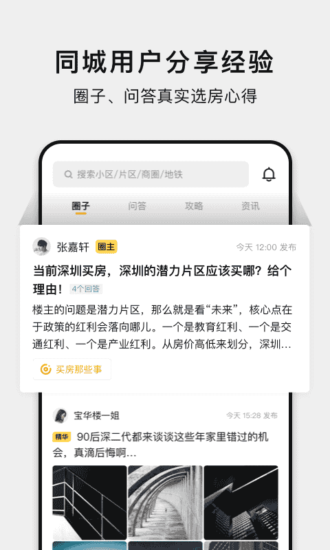 3、同城用戶分享經(jīng)驗(yàn),圈子、問答真實(shí)選房心得,針對(duì)購房人群看房選房、交易過戶、投資買房、金融貸款、戶型評(píng)說、片區(qū)分析等內(nèi)容展開談?wù)摵徒涣鳌?/p>