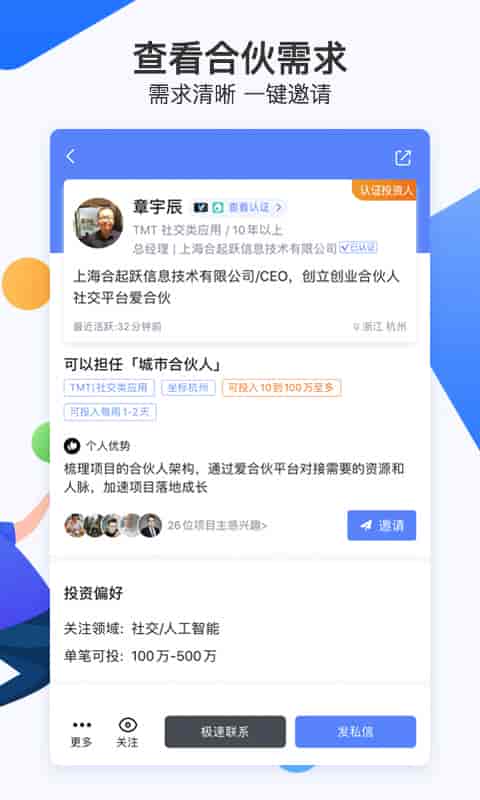 愛合伙是一款由上海合起躍信息技術有限公司推出的創業社交軟件。