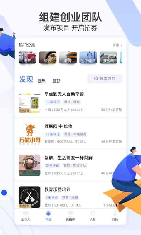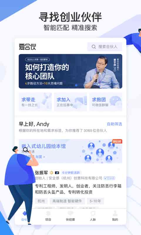 2、智能匹配,精準搜索,尋找創業伙伴;組建創業團隊,發布項目,開啟招募。