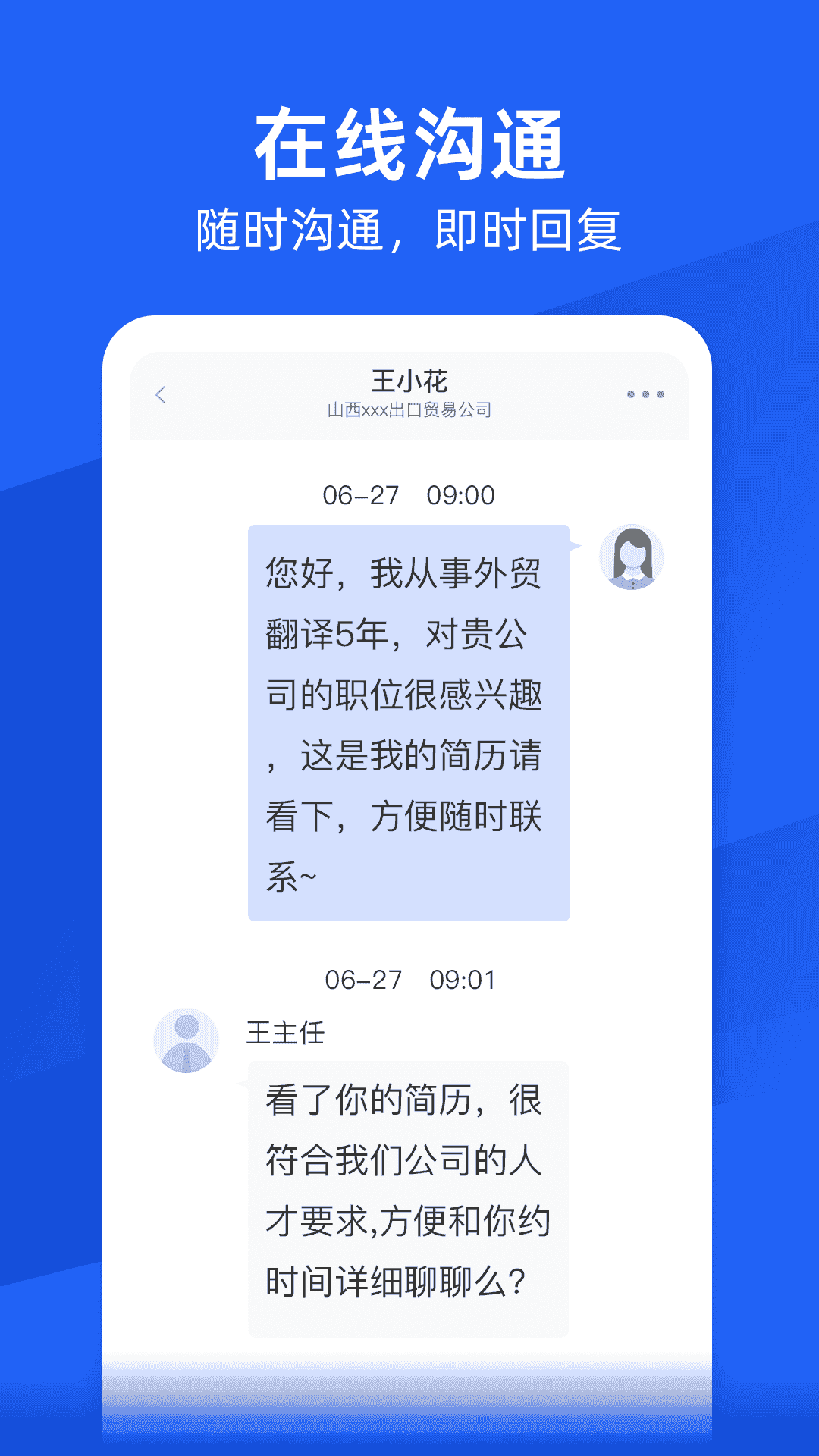 3、在線面試:支持在線視頻面試功能,無論身處何地,都能輕松完成面試流程。