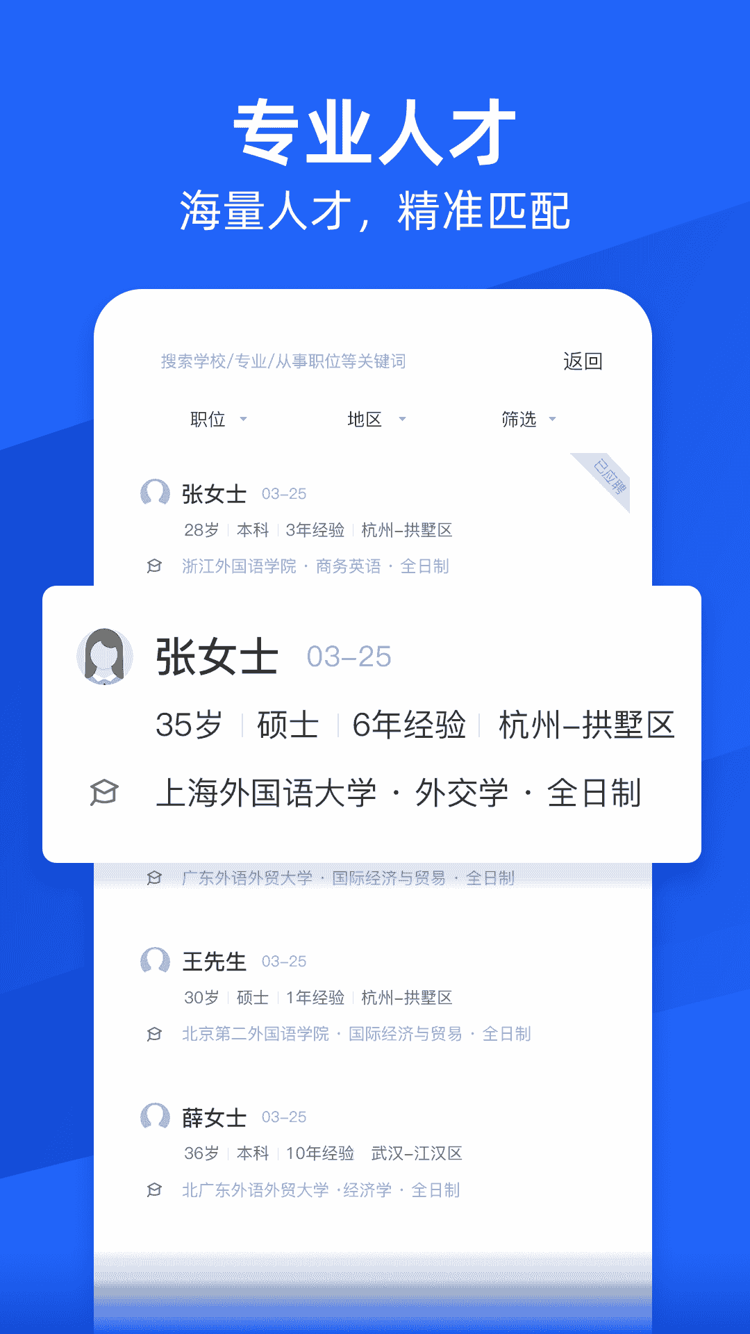 2、行業(yè)專業(yè):專注于語言類人才,匯聚眾多外語專業(yè)的優(yōu)秀人才。