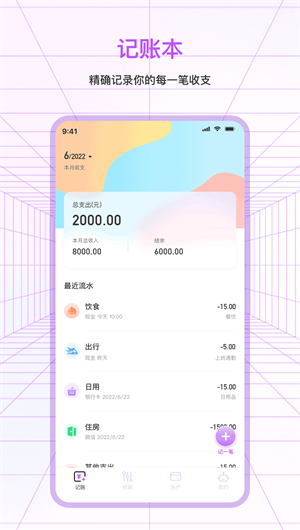 1、快速記賬:用戶可快速記錄每筆支出和收入,支持分類標簽、備注等功能,方便查詢和統計。