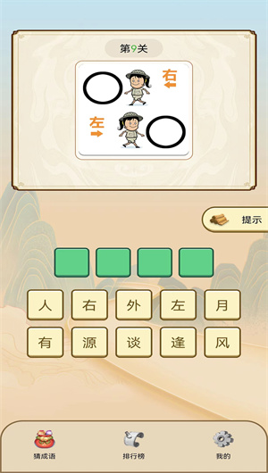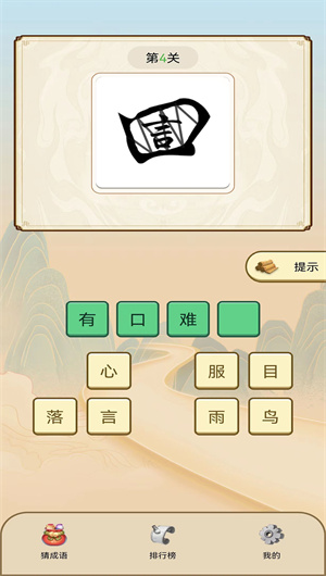 觀看插畫:每個關卡都有一個與成語相關的精美插畫,玩家需要通過觀察插畫來猜出對應的成語。