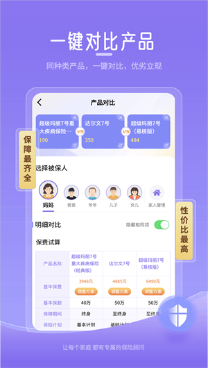 保險對比: 用戶可以選擇多款保險進行比較,APP將會以圖表的形式展示出各個保險產品的優劣。