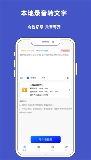 本地錄音轉文字:只需要將你的錄音導入九錘聽寫APP,它就可以自動將你的語音轉化為文字,方便你整理和使用。