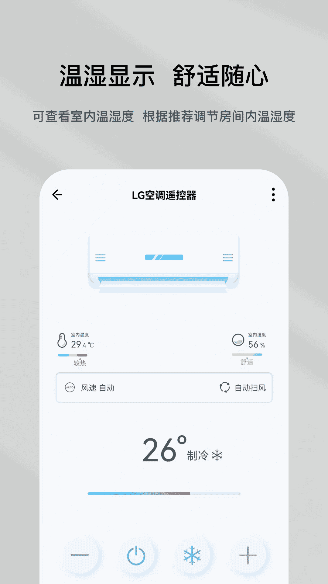 1、溫濕顯示舒適隨心,可查看室內溫濕度根據(jù)推薦調節(jié)房間內溫濕度