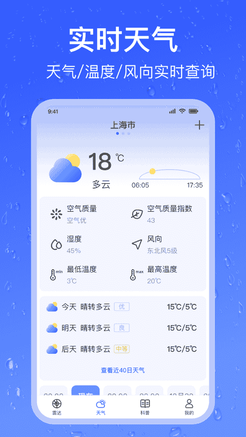 1、自動定位城市,自動生成24小時預(yù)報、未來40天天氣預(yù)報等。